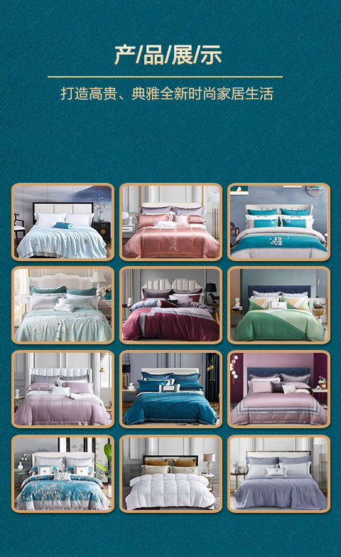 黛富妮家纺将“健康、实用、时尚”三大要素完美地融入款款床品之中,形成了爱花舞、品味、儿童、都会、婚庆、枕被、毯垫、卫浴等八大系列产品,并不断超越自我,持续拓展家饰用品技术领域,开发功能性等全新产品。